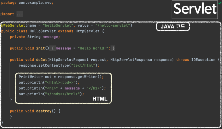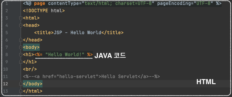 - html μ½λ μμ java μ½λκ° μ½μ λ ννλ‘ <%...%>οΌ<%!...%>, <%=•••%>μ κ°μ ννμ μ½λκ° μλ° μ½λμ΄λ€.