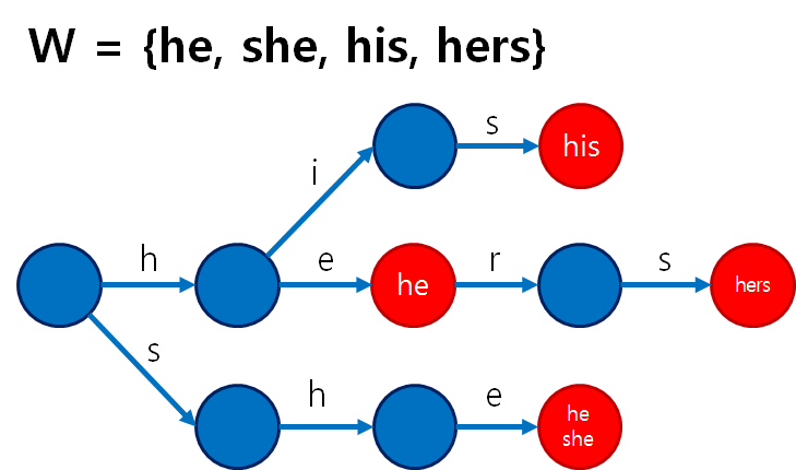 - output ๋ ธ๋(๋นจ๊ฐ ๋ ธ๋)์ ๋์ฐฉํ๋ค๋ฉด, ๋ ธ๋์ ์ ํ์๋ ๋ฌธ์์ด์ด ๋ฌธ์์ด S์ ๋ฑ์ฅํ๋ค๋ ๋ป์ด๋ค.