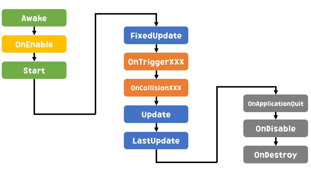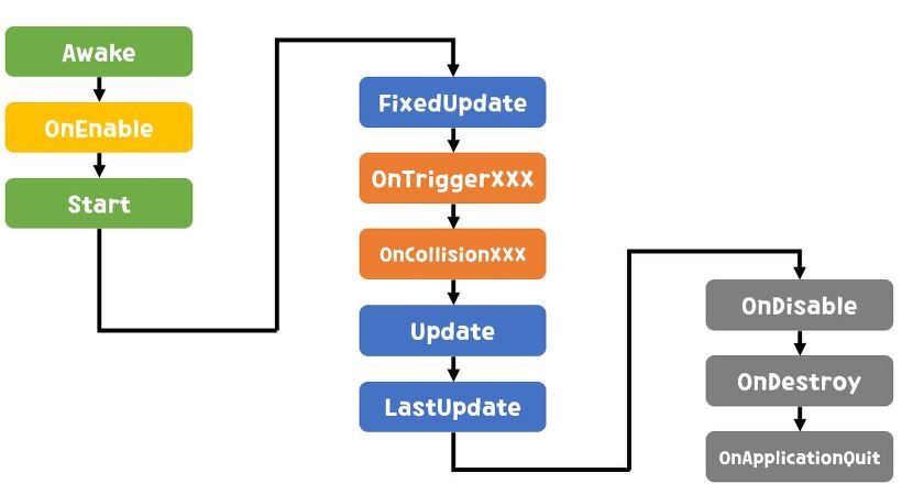 μ λν° μ€ν¬λ¦½νΈμ λλΆλΆμ Monobehaviour ν΄λμ€λ₯Ό μμλ°μ λ§λ€μ΄μ§λ€. μ΄ ν΄λμ€λ₯Ό μμλ°μ μ€λΈμ νΈλ Sceneμ μλ λμ μμ§μμ μΌμ ν νλ¦μ λ°λΌ μλμΌλ‘ ν¨μλ₯Ό νΈμΆνλλ°, μ΄ ν¨ν΄μ νλ¦μ μλͺ μ£ΌκΈ°(Life Cycle)λΌ λΆλ₯Έλ€.