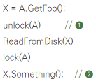 ๋๋ฐ์ด์ค ํ์ ๋์(ReadFromDisk)์๋ ๋ฎคํ ์ค ์ ๊ธ์ ํ์ง ์๋๋ค. ๋จ, ๋๋ฐ์ด์ค ํ์ ๋์ X๊ฐ ๋ณ๊ฒฝ๋์์ ๊ฐ๋ฅ์ฑ์ด ์์ผ๋ ๋ฎคํ ์ค ์ ๊ธ ํ A์ ์ํ ์ฒดํฌ๋ฅผ ๋ค์ ํด์ผ ํ๋ค.