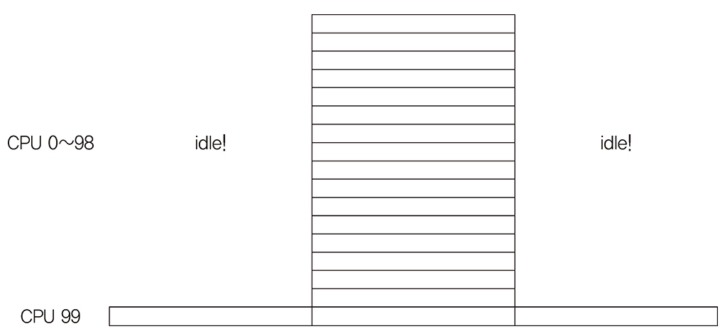 - ๋ณ๋ ฌ์ฑ์ด ์ ๋๋ก ๋์ค์ง ์๋ ๊ฒ, ์ฆ ๋ณ๋ ฌ๋ก ์คํ๋๊ฒ ํ๋ก๊ทธ๋จ์ ๋ง๋ค์๋๋ฐ ์ ์ ํ CPU๋ง ์ฐ์ฐ์ ์ํํ๋ ํ์์ ์๋ฆฌ์ผ ๋ณ๋ชฉ์ด๋ผ ํ๋ค.