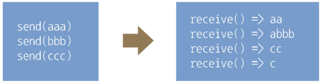 ์๋ฅผ ๋ค์ด ํ๋ก๊ทธ๋จ์ด ๋งค์ฐ ๊ธด ์คํธ๋ฆผ์ ์ก์ ํ ๋ ์ด์์ฒด์ ๋ IP ํจํท ํฌ๊ธฐ ์ ํ์ ๋ง์ถฐ ๋จํธํ๋ฅผ ํ๋ค. ๊ฐ ์กฐ๊ฐ์ IP ํจํท ํ๋ํ๋๊ฐ ๋์ด ์ก์ ๋๊ณ ๋ฐ๋ ์ชฝ์์๋ ์ด ์กฐ๊ฐ๋ค์ ๋ฐ์ ์กฐ๋ฆฝํ ํ ์คํธ๋ฆผ ํํ๋ก ๋ณต์ํ๋ค.
