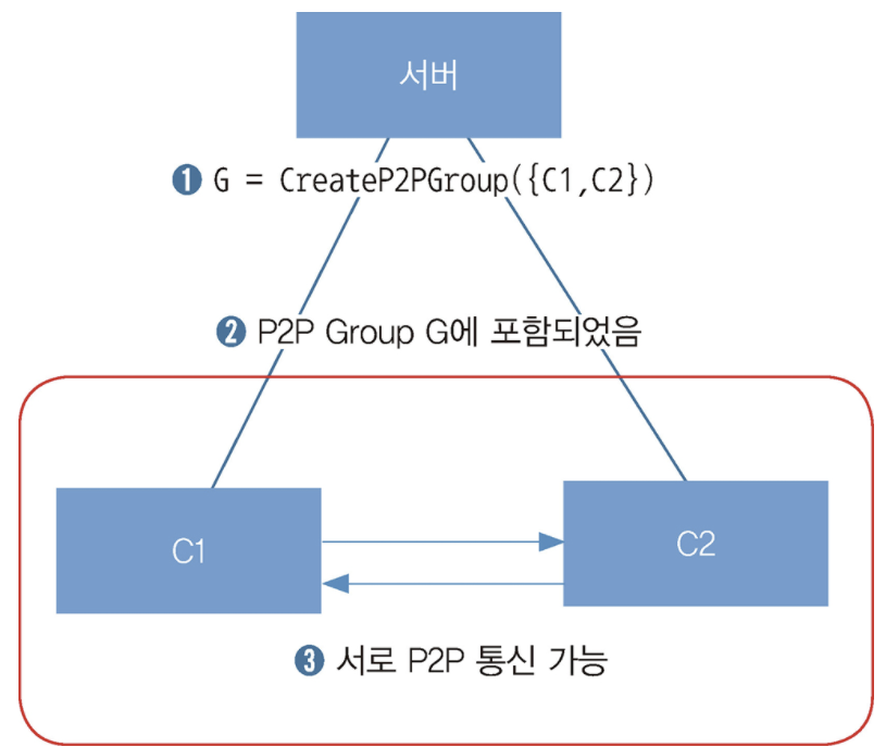 - μλ²κ° μΉμΈν΄μΌλ§ P2P μ°κ²°μ΄ κ°λ₯νλ€. μλ²μμ ν΄λΌμ΄μΈνΈ 1κ³Ό 2λ₯Ό P2P μ°κ²°νλΌκ³ μ§μνλ©΄, ν΄λΌμ΄μΈνΈ 1κ³Ό 2λ μλ‘κ° P2P μ°κ²°μ΄ λμμμ μ¦μ μ μ μλ€.