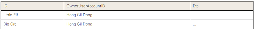 ์บ๋ฆญํฐ๋ ์๊ธฐ ์์ ์ ์์ ํ๋ ํ๋ ์ด์ด๊ฐ ์์ผ๋ฏ๋ก ์บ๋ฆญํฐ ๊ณ ์ ID ๋ฟ๋ง ์๋๋ผ ์์ ์๊ฐ ๋๊ตฌ์ธ์ง ์ ์ ์๋ ์ ๋ณด๋ ํจ๊ป ์ ์ฅํด์ผ ํ๋ค. ์ด๋ ์์ฃผ ์ฌ์ฉํ๋ ๋ฐฉ์์ ์ธ๋ ํค์ด๋ค. ์ธ๋ ํค๋ ํ ์ด๋ธ์ ์ด๋ค ํ๋๊ฐ ๋ค๋ฅธ ํ ์ด๋ธ์ ํน์ ํ๋ ๊ฐ์ ๊ฐ๋ฆฌํค๋ ๊ฒ์ ์๋ฏธํ๋ค. ์ฆ, OwnerUserAccountID ํ๋๋ UserAccount ํ ์ด๋ธ์ ID ํ๋๋ฅผ ๊ฐ๋ฆฌํค๋ ์ธ๋ ํค์ด๋ค.