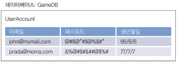 GameDB๋ผ๋ ๋ฐ์ดํฐ๋ฒ ์ด์ค ์ธ์คํด์ค๊ฐ ์๊ณ ๊ทธ ์์๋ UserAccount๋ผ๋ ํ ์ด๋ธ์ด ์๋ค. ๊ทธ๋ฆฌ๊ณ ๊ทธ ํ ์ด๋ธ ์์๋ john, prada์ ๋ํ ๋ ์ฝ๋๊ฐ ์์ผ๋ฉฐ ์ด๋ฉ์ผ, ํจ์ค์๋, ์๋ ์์ผ์ด๋ผ๋ ํ๋๊ฐ ์๋ค. ์ฆ, ์ด ํ ์ด๋ธ์ ํ๋ ์ด์ด ์ ๋ณด๋ฅผ ์ ์ฅํ๋ ์ฉ๋์ด๋ค