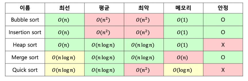 - ๊ณต๊ฐ ๋ณต์ก๋์ ๋ฐ๋ผ ์ ํ: ๋ณํฉ ์ ๋ ฌ ๊ฐ์ ๊ฒฝ์ฐ ์ถ๊ฐ ๋ฉ๋ชจ๋ฆฌ ๊ณต๊ฐ์ ์ฌ์ฉํด์ผ ํ๋ค.