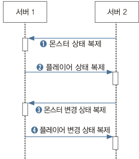- ์๋ฒ 1์์๋ ํ๋ ์ด์ด ์บ๋ฆญํฐ ์ ๋ณด๋ฅผ ๊ฐ์ง๊ณ ์๊ณ ์๋ฒ 2์์๋ ๋ชฌ์คํฐ ์บ๋ฆญํฐ ์ ๋ณด๋ฅผ ๊ฐ์ง๊ณ ์๋ค.