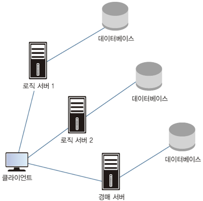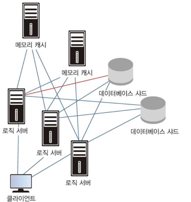 ๊ฒ์ ํ๋ ์ด ๋ก์ง์ ๋ด๋นํ๋ ์๋ฒ์ ๊ฒ์ ํ๋ ์ด์ด์ ๋ฉ๋ชจ๋ฆฌ ๋ด๋ถ ์ ๋ณด๋ฅผ ๊ฐ์ง ์๋ฒ๊ฐ ๋ถ๋ฆฌ๋๋ค. ๊ฒ์ ํ๋ ์ด ๋ก์ง๋ง ๋ด๋นํ๋ ์๋ฒ๋ ์ํ ํ์ฅ๋ ๋ก์ง ์๋ฒ๋ผ๊ณ ํ๋ค. ๊ทธ๋ฆฌ๊ณ ์ํ ํ์ฅ๋ ๋ฉ๋ชจ๋ฆฌ ์บ์๊ฐ ๋ก์ง ์๋ฒ ๋ค์ ์๋ค. ๊ฒ์ ํด๋ผ์ด์ธํธ๋ ๋ฉ๋ชจ๋ฆฌ ์บ์์ ์ง์ ์ก์ธ์ค ํ ์ ์๋ค. ๋ก์ง ์๋ฒ๋ค ๋ค์๋ ์ํ ํ์ฅ๋ ๋ฐ์ดํฐ๋ฒ ์ด์ค๋ ์๋ค.