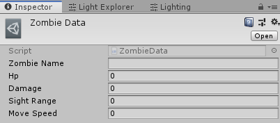 ์์ฑ๋ ScriptableObject ์ธ์คํด์ค๋ฅผ ํด๋ฆญํ๋ฉด ์ธ์คํํฐ ๋ทฐ์์ Zombie Data์ ๋ํ ํ๋กํผํฐ๋ค์ ํ์ธํ ์ ์๋ค.
