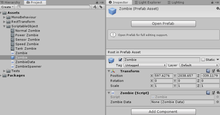 Zombie ํ๋ฆฌํน ๋ด zombieData๋ ์๋ก ์ค์ ํ ScriptableObject๋ก ์ค์ ํ๋ฉด ๋๋ค.