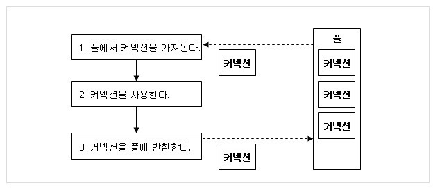 - ์์ฒญ ์ฒ๋ฆฌ๊ฐ ๋๋๋ฉด ์ฌ์ฉ๋ Connection ๊ฐ์ฒด๋ฅผ ๋ค์ Pool์ ๋ฐํํ๋ค.