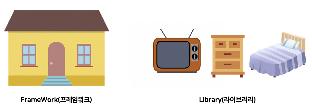 νλ μμν¬λ μ§, λΌμ΄λΈλ¬λ¦¬λ μ§ μμ ν¬ν¨λλ κ°κ΅¬λ‘ λΉμ ν μ μλ€. νλ μμν¬λ κ°μ Έλ€ μ¬μ©νλ€λ κ²λ³΄λ€λ νλ μμν¬λΌλ νΉμ 곡κ°μ λ€μ΄κ°μ μ¬μ©νλ κ²μ΄λ©° λΌμ΄λΈλ¬λ¦¬λ λΌμ΄λΈλ¬λ¦¬ μ체λ₯Ό κ°μ Έκ° μ¬μ©νκ³ νΈμΆνλ μ©λμ΄λ€.