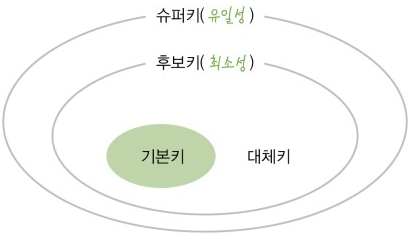 - μνΌ ν€(Super Key): μμ±λ€μ μ§ν©μΌλ‘ μ μΌμ±μ λ§μ‘±νμ§λ§ μ΅μμ±μ λ§μ‘±μν€μ§ λͺ»νλ€.
