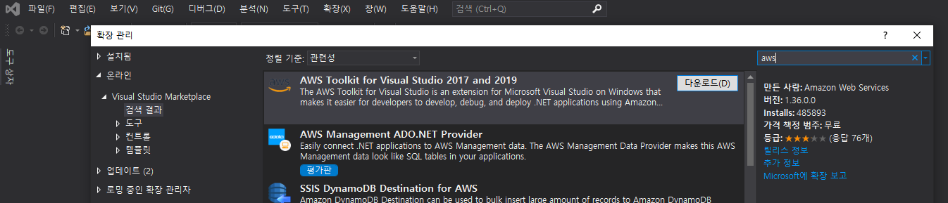 ๋จผ์ Visual Studio๋ฅผ ์คํํ๊ณ AWS Toolkit for Visual Studio ์ค์น๊ฐ ํ์ํ๋ค.