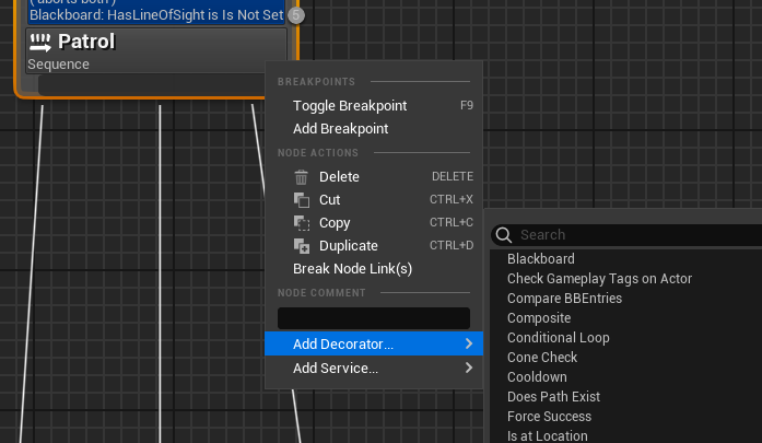 - Patrol ์ํ์ค: HasLineOfSight(ํ๋ ์ด์ด ๋ฐ๊ฒฌ)๊ฐ Is Not Set์ผ ๋ ๋ถ๊ธฐ๋ฅผ ์คํํ๋ค. ๋งต์์ ๋๋ค ์์น๋ฅผ ์ฐพ์ ์ด๋ํ๊ณ ๊ทธ ์์น์์ ์ ์ ๋๊ธฐํ๋ค๊ฐ, ๋ค์ ๋ฐ๋ณตํ๋ ์ํ์ค์ด๋ค.