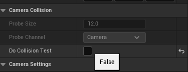 ๊ทธ๋์ ์นด๋ฉ๋ผ Collision์ ์ง์ ๊ตฌํํด ๋ณผ ๊ฒ์ด๋ค. ๋จผ์ ์บ๋ฆญํฐ ์นด๋ฉ๋ผ์ Do Collision Test๋ฅผ fasle๋ก ๋ณ๊ฒฝํ๋ค.