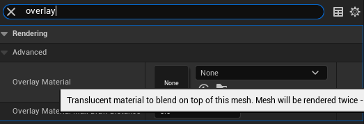 Overlay Material은 기존 액터에 설정된 Material에 추가로 블렌드 하기 위한 Material이다. 외곽선, 빛 등 여러 여러 효과를 넣을 수 있다.
