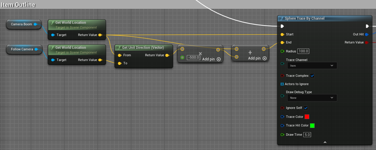 - End: SpringArmCamera의 월드 위치 + SpringArmCamera와 FollowCamera 사이의 방향 벡터 * 탐지할 범위