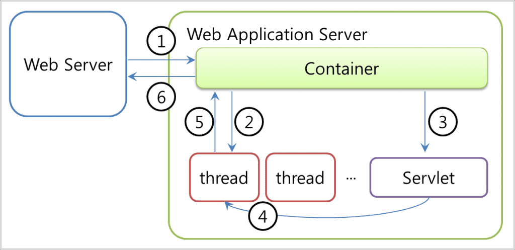 - 컨ν μ΄λλ λ°°ν¬ μμ μ(web.xml)λ₯Ό μ°Έμ‘°νμ¬ μλΈλ¦Ώμ μμ μ λ΄λΉνλ μ€λ λλ₯Ό μμ±νκ³ μμ²(httpServletRequest) λ° μλ΅(httpServeletResponse) κ°μ²΄λ₯Ό μμ±νμ¬ μ λ¬νλ€.