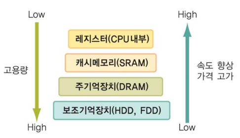 ๋ ์ง์คํฐ, ์บ์ ๋ฉ๋ชจ๋ฆฌ, ์ฃผ ๊ธฐ์ต์ฅ์น, ๋ณด์กฐ ๊ธฐ์ต์ฅ์น๋ฅผ ๊ณ์ธต ๊ตฌ์กฐ๋ก ๋ถ๋ฅํ ์ ์๊ณ ์์์ ๊ธฐ์ต์ฅ์น์ผ์๋ก ์ ๊ทผ ์๋์ ์๊ฐ์ด ๋น ๋ฅด์ง๋ง ์ฉ๋์ด ์ ๊ณ ๊ณ ๊ฐ์ด๋ค.