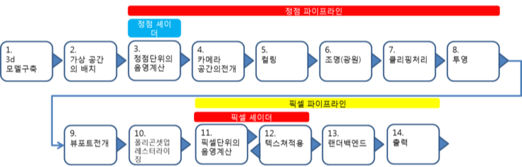 3D μΈκ³μ κ΄μ μ²λ¦¬λ₯Ό νλ λ¨κ³λ‘ μ λ°μ¬κ΄(Specular), λλ°μ¬κ΄(Diffuse), νκ²½κ΄(Ambient) λ±μ΄ μλ€.