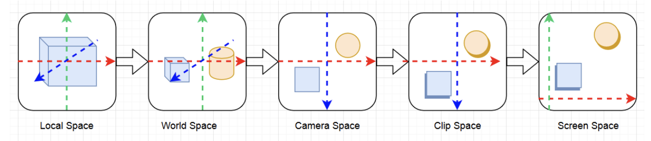 λΆλ¬μ¨ 3D λͺ¨λΈμ μλ μ’νκ³λ‘ λ³ννλ λ¨κ³μ΄λ€. λ‘컬 μ€νμ΄μ€μ κ°μ²΄λ€μ μλ μ’νκ³λ‘ λ³ννλλ° μ΄λ, νμ , ν¬κΈ° λ³νμ μ‘°ν©νμ¬ λ§λ€μ΄μ§λ€.
