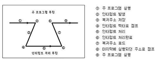 - ํ์ฌ ์ํ ์ค์ธ ํ๋ก๊ทธ๋จ์ ๋ฉ์ถ๊ณ , ์ํ ๋ ์ง์คํฐ์ PC ๋ฑ์ ์คํ์ ์ ์ ์ ์ฅํ ๋ค์ ์ธํฐ๋ฝํธ ์๋น์ค ๋ฃจํด์ผ๋ก ๊ฐ๋ค. ์ธํฐ๋ฝํธ ์๋น์ค ๋ฃจํด์ด ๋๋๋ฉด ๋ค์ ์๋ ์์ ์ผ๋ก ๋ณต๊ตฌํ๋ค.